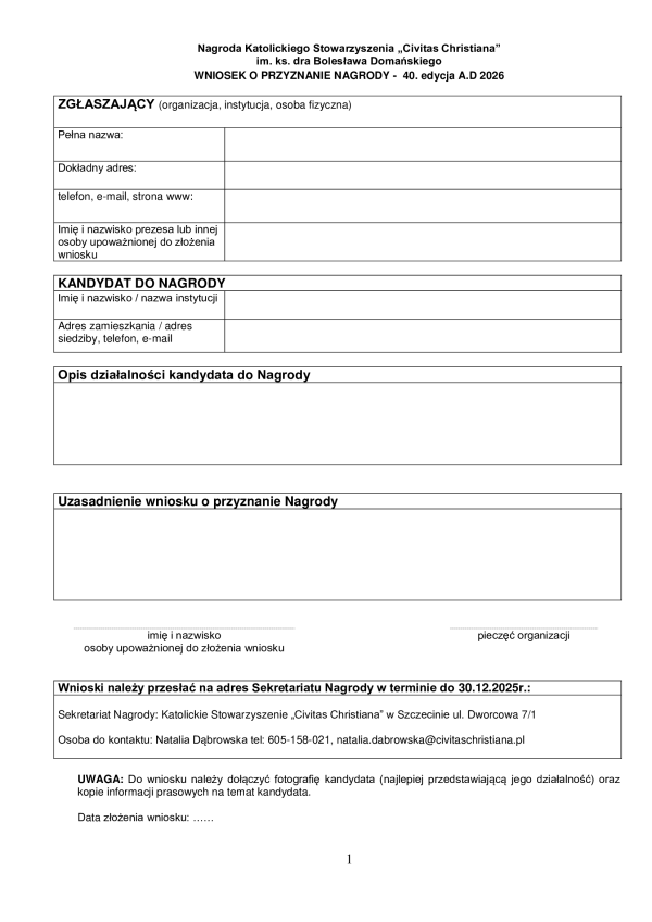 Zgłoszenia kandydatów i składanie wniosków do Nagrody im. ks. dra Bolesława Domańskiego Katolickiego Stowarzyszenia „Civitas Christiana” przyjmowane są do 31.12.2025 r. pod adresem: natalia.dabrowska@civitaschristiana.pl lub ul. Wojska Polskiego 42 piętro 2 lokal 7, 70-475 Szczecin.