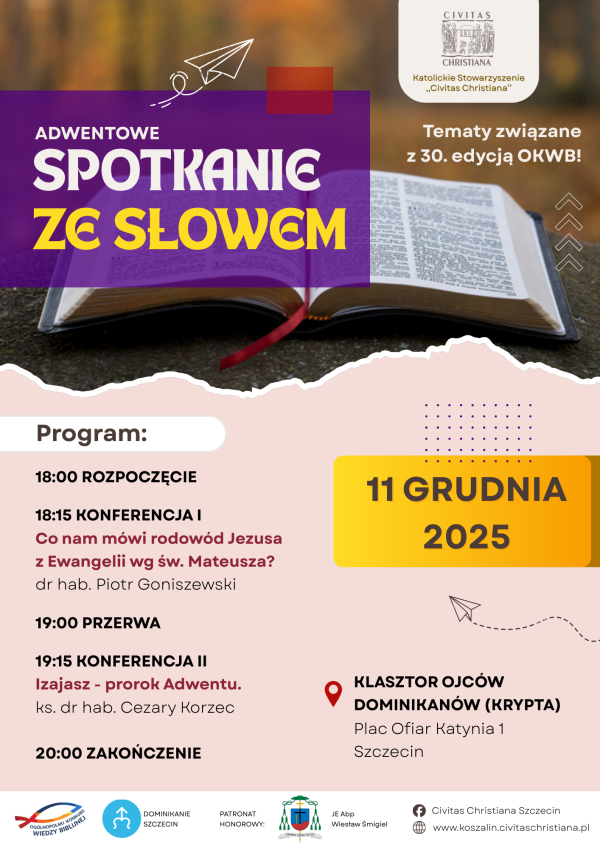 Katolickie Stowarzyszenie "Civitas Christiana" oddział w Szczecinie zaprasza na Adwentowe Spotkanie ze Słowem. W dwóch konferencjach poruszone zostaną tematy zawarte w zakresie tegorocznego Ogólnopolskiego Konkursu Wiedzy Biblijnej.