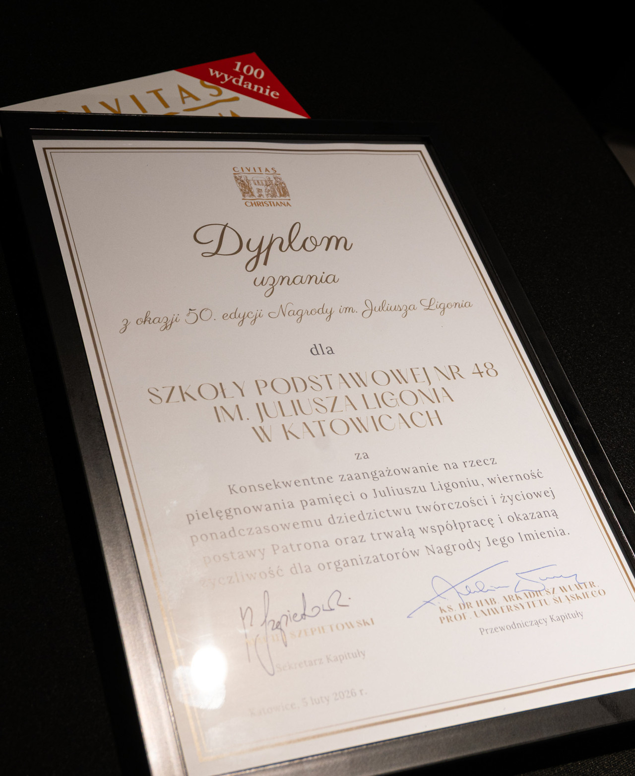 Uroczysta gala 50. edycji nagrody była także okazją do wyrażenia słów wdzięczności i przekazania okolicznościowego dyplomu uznania dla dyrekcji, grona pedagogicznego i uczniów Szkoły Podstawowej nr 48 im. Juliusza Ligonia w Katowicach, której delegacja z pocztem sztandarowym od lat uczestniczy katowickiej uroczystości wręczenia wyróżnień - wyjątkowym święcie Juliusza Ligonia. Dyplom z okazji jubileuszu został przyznany również prof. Franciszkowi Markowi, członkowi Kapituły, wybitnemu autorytetowi, który choć w tym roku nie mógł uczestniczyć w gali, od lat nieustannie twórczo inspiruje kapitułę i organizatorów nagrody.