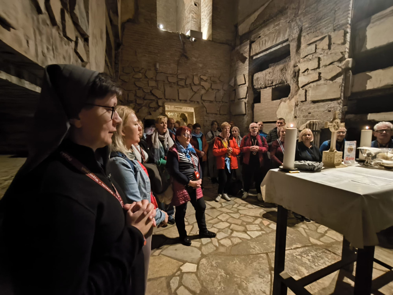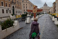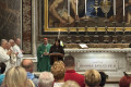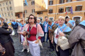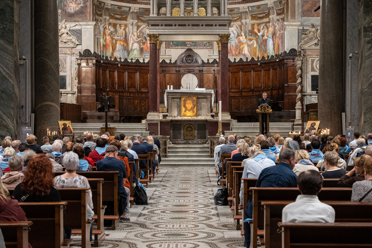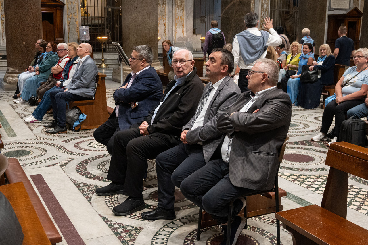 Najważniejszym punktem spotkania w bazylice NMP na Zatybrzu była Msza św. celebrowana przez pielgrzymujących z nami kapłanów pod przewodnictwem ks. Dariusza Wojteckiego, asystenta krajowego „Civitas Christiana”. W kazaniu przypomniał on, że „powołaniem naszym, w naszym byciu w Stowarzyszeniu i pośród ziemskich miast w naszej Ojczyźnie, jest budowanie miasta Chrystusa. (…) Miasto Chrystusa to przestrzeń sumienia i serca, w której dwa zdania naszych wielkich świętych orędowników Jana Pawła II i kard. Stefana Wyszyńskiego współbrzmią wzajemnie: nie lękajcie się i otwórzmy drzwi Chrystusowi – wyjaśniał kaznodzieja. Zachęcał byśmy otworzyli drzwi naszych serc, drzwi naszego Stowarzyszenia i odważnie realizowali program duchowy, który nam pozostawili, a który ani się nie zestarzał, ani się nie zestarzeje z czasem. „Dla naszego Patrona Kościół był wspólnotą sumień, które się nigdy nie poddają dyktatowi kłamstwa. Dla Jana Pawła II był wspólnotą osób, które odkrywają swoją godność w świetle wcielenia Piękna. Obaj wiedzieli, że odnowa świata nie pochodzi z zewnątrz, ale z wnętrza serc oddanych Chrystusowi przez Maryję” – mówił ks. Wojtecki.