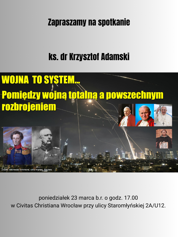Serdecznie zapraszamy na spotkanie, które odbędzie się w poniedziałek 23 marca b.r. o godz. 17.00 w siedzibie Katolickiego Stowarzyszenia "Civitas Christiana" we Wrocławiu przy ulicy Staromłyńskiej 2A/U12.