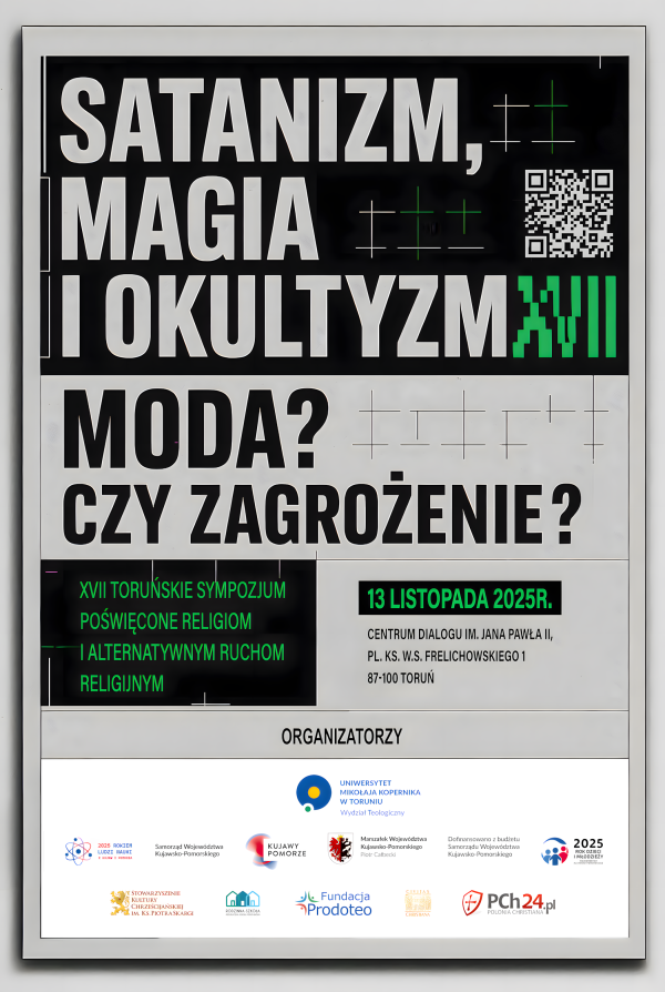 Tematem XVII Toruńskiego Sympozjum poświęconego religiom i alternatywnym ruchom religijnym będzie "Satanizm, magia, okultyzm - moda czy zagrożenie? Kontekst społeczno-prawny". Wydarzenie odbędzie się 13 listopada 2025 r. (czwartek) w godzinach 9:00 - 14:30 w Centrum Dialogu Jana Pawła II.