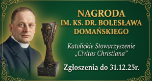Do 31 grudnia trwa przyjmowanie wniosków do uhonorowania Nagrodą im. ks. dr. Bolesława Domańskiego. To prestiżowe wyróżnienie adresowane jest do osób zasłużonych dla promowania wartości chrześcijańskich i polskości. Wręczane jest m.in. na Pomorzu Zachodni…